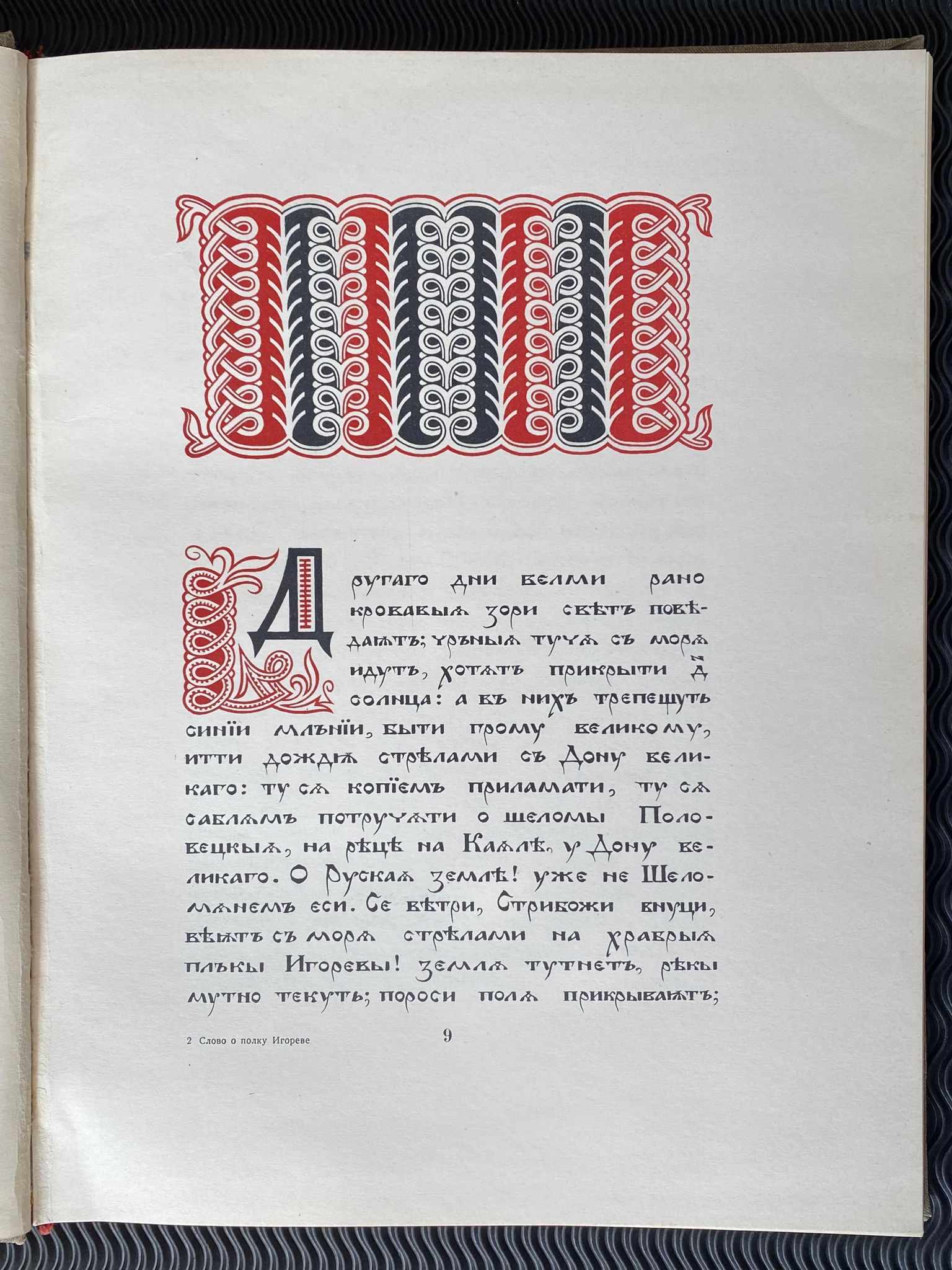 Древнерусский текст. Слово о полку Игореве. Игора сына Святослава, внука Ольгова. Москва: Государственное издательство художественной литературы, 1959. Древнерусский текст, подготовленный к печати В.Ф. Ржигой и С.К. Шамбинаго и писанный палехским мастером И. Голиковым. Рисунки проф. М.А. Рыбниковой. Перевод на современный русский язык Ивана Новикова. Оформление художника И. Бекетова Хорошее состояние. Корешок книги цел. Присутствуют пятна на внутренней стороне обложки. Внешняя обложка с небольшой потертостью. Первая часть книги на древнерусском, вторая- на русском. Old Russian text. The Tale of Igor’s Campaign. Igor the son of Svyatoslav, the grandson of Olgov. Moscow: State Publishing House of Fiction, 1959. The Old Russian text prepared for publication by V.F. Rzhiga and S.K. Shambinago and written by the Palekh master I. Golikov. Drawings by Prof. M.A. Rybnikova. Translated into modern Russian by Ivan Novikov. Design by the artist I. Beketov Good condition. The spine of the book is intact. There are spots on the inside of the cover. The outer cover is slightly worn. The first part of the book is in Old Russian, the second is in Russian.