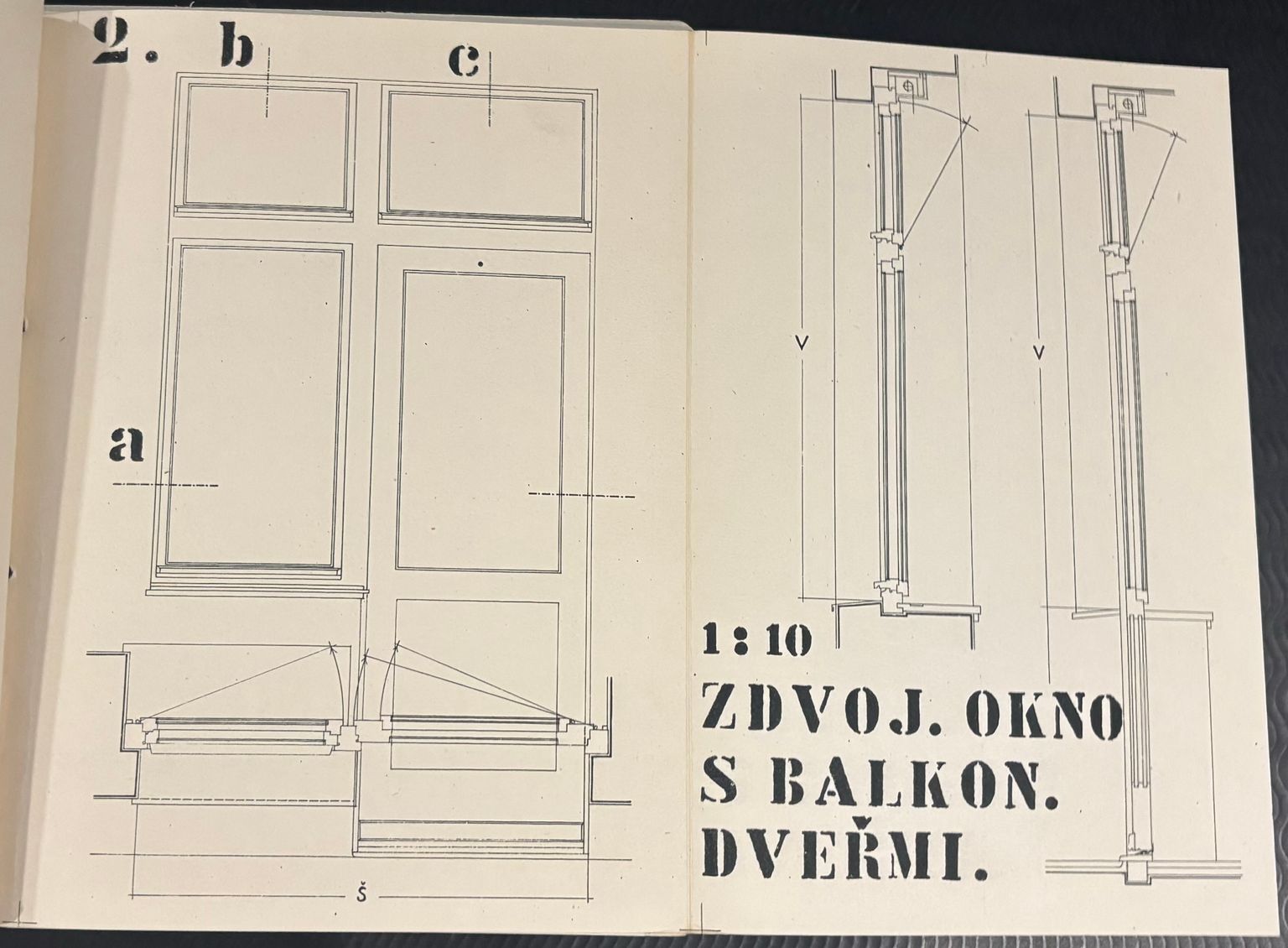 Bauer, Jaroslav; Vacek, Ferdinand. Naše okna s podrobným popisem a detail . plány měř 1:1. S přílohou oken dvouletky. Praha, cca 1947 (Josef Čermák). 25 s v sešitové vazbě a dále desky s výkresy oken velkého formátu na více listech. Zabaleno v ochranném kartonu. Dobrý stav, mírně opotřebované kartonové desky, sešitová vazba lehce zašpiněná. Lehce zprohýbaný hřbet knihy a kartonového obalu.
